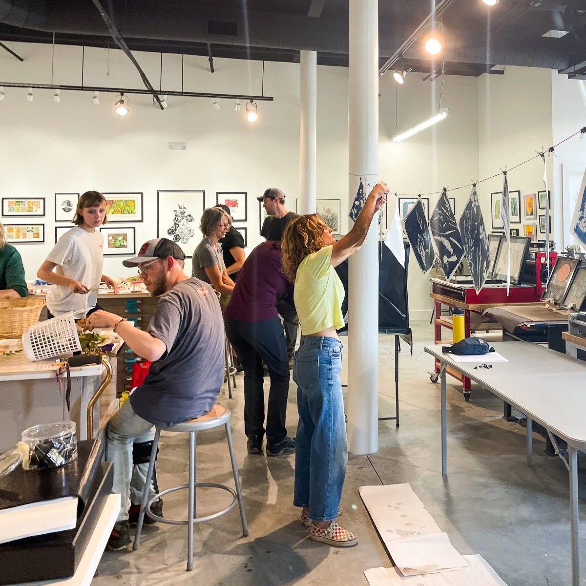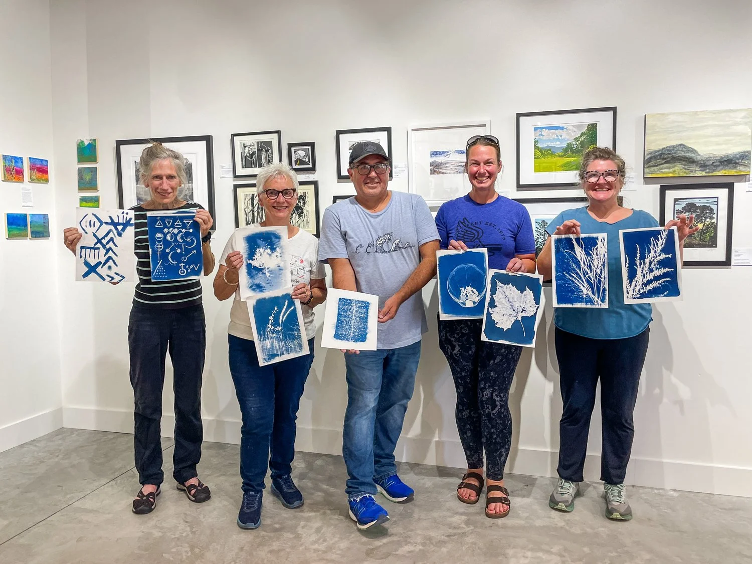 Blue Ridge Blueprints hosts introductory and advanced cyanotype and photogravure workshops in Asheville, NC and around the Southeast United States. Sign-up to our mailing list to stay up-to-date on our public workshop offerings, or simply schedule a private cyanotype workshop for up to 6 people at our Asheville “school”, the Canie Creek Community College. The introductory cyanotype workshop is fun for all ages, lasts two hours, and you’ll leave with a stack of prints, working knowledge of the cyanotype process, and some great memories. Eric, our workshop instructor, is a former college art & design professor and has been leading cyanotype and photogravure workshops independently since 2021.